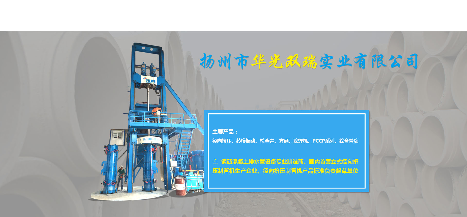 ????????揚(yáng)州市華光雙瑞實業(yè)有限公司,位于中國歷史文化名城揚(yáng)州市東郊江都區(qū)丁伙工業(yè)園區(qū),公司成立于2000年10月,是一家專門致力于鋼筋混凝土排水管生產(chǎn)裝備的設(shè)計開發(fā)、加工制造、銷售服務(wù)的專業(yè)制造商。公司2016年度被授予全國建材機(jī)械產(chǎn)品定點生產(chǎn)企業(yè),2017年度被授予中國混凝土與水泥制品協(xié)會會員單位,江蘇省認(rèn)定企業(yè)技術(shù)中心,江蘇省研究生工作站,揚(yáng)州市水泥制品工程技術(shù)研究中心,先后承擔(dān)過國家火炬計劃項目一項,省科技項目二項,揚(yáng)州市重點研發(fā)項目一項。公司擁有自主知識產(chǎn)權(quán)36項(發(fā)明專利6項,實用新型專利30項),公司研發(fā)的13種產(chǎn)品榮獲江蘇省高新技術(shù)產(chǎn)品稱號。公司產(chǎn)品有立式徑向擠壓制管機(jī)系列、芯模振動制管機(jī)系列、檢查井系列、方涵系列、自動變徑滾焊機(jī)系列、PCCP系列、綜合管廊系列。核心產(chǎn)品立式徑向擠壓機(jī)2014年度榮獲混凝土與水泥制品行業(yè)技術(shù)革新一等獎,2015年度獲江蘇省機(jī)械工業(yè)科技進(jìn)步二等獎,2016年度獲全國建材行業(yè)技術(shù)革新一等獎,預(yù)制混凝土檢查井生產(chǎn)線榮獲混凝土與水泥制品行業(yè)2017年度技術(shù)革新二等獎,2011年度立式水泥制管成型機(jī)獲混凝土與水泥制品行業(yè)技術(shù)革新三等獎。公司還是國內(nèi)首套立式徑向擠壓制管機(jī)的生產(chǎn)企業(yè),該產(chǎn)品2012年起填補(bǔ)了國內(nèi)同類產(chǎn)品的空白,公司2013年被國家建筑材料工業(yè)機(jī)械標(biāo)準(zhǔn)技術(shù)委員會批準(zhǔn)為《鋼筋混凝土排水管 芯模振動制管機(jī)》《水泥制品用鋼筋混凝土管排水管鋼筋骨架滾焊機(jī)》的行業(yè)標(biāo)準(zhǔn)制定單位,2017年11月被國家建筑材料工業(yè)機(jī)械標(biāo)準(zhǔn)技術(shù)委員會批...
